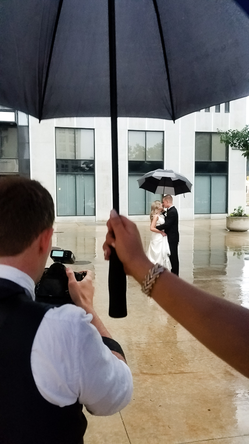 Another tricky lighting setup – the staircase at the Renaissance Hotel. I had two remote strobes placed up on the second floor, pointing down. Knowing there could be issues with shadows, I needed two people to fill in for the bride and groom. Thanks, Erica and Fallon!